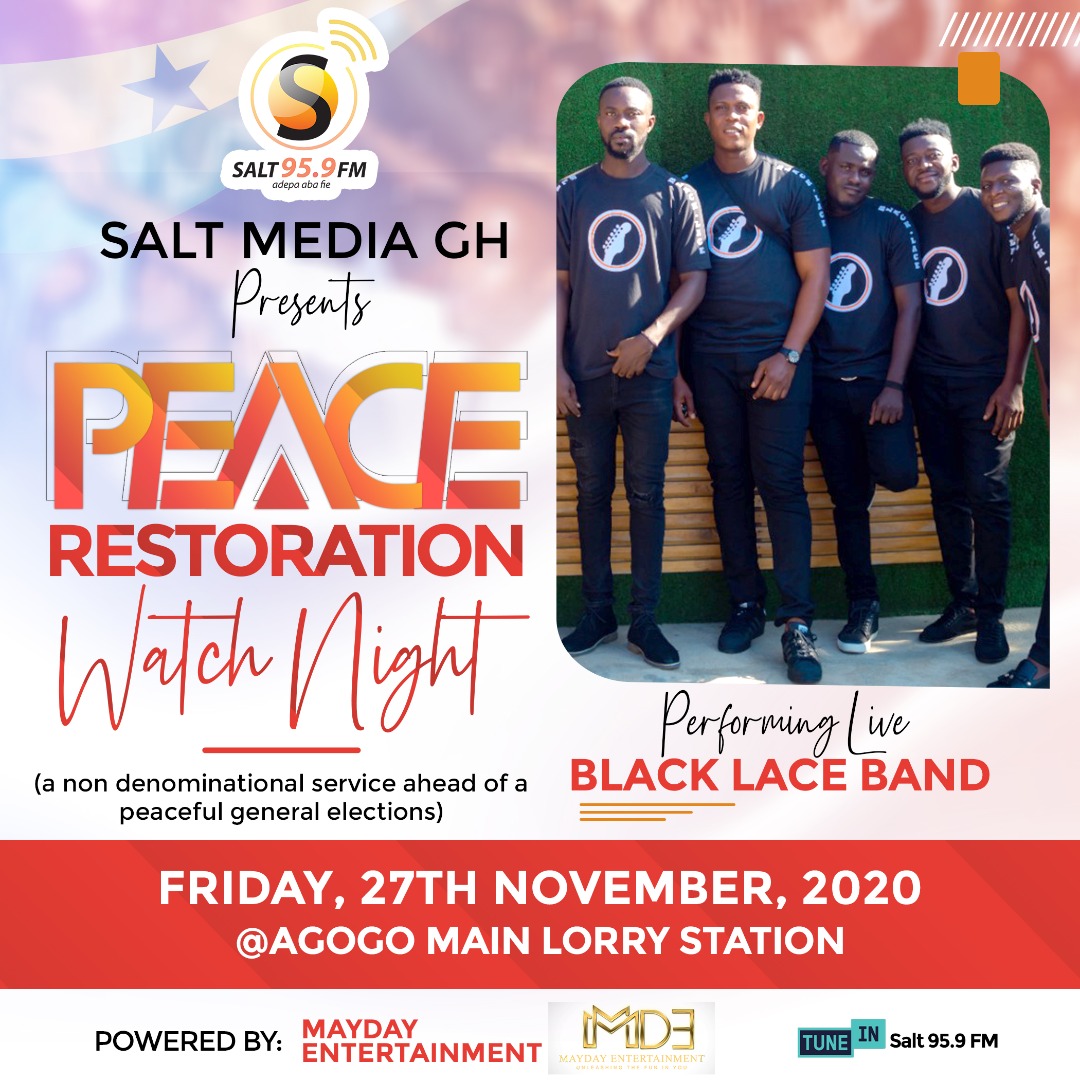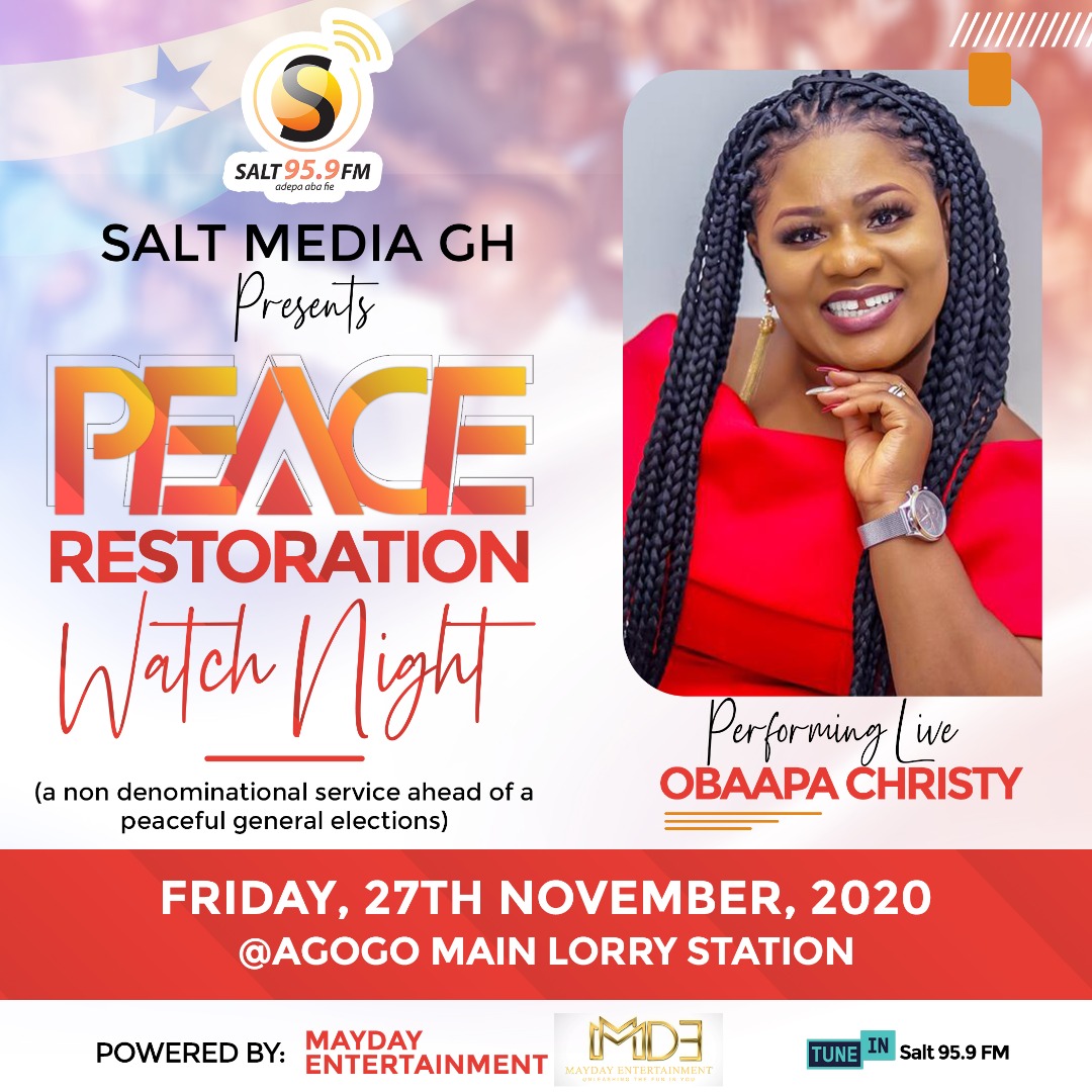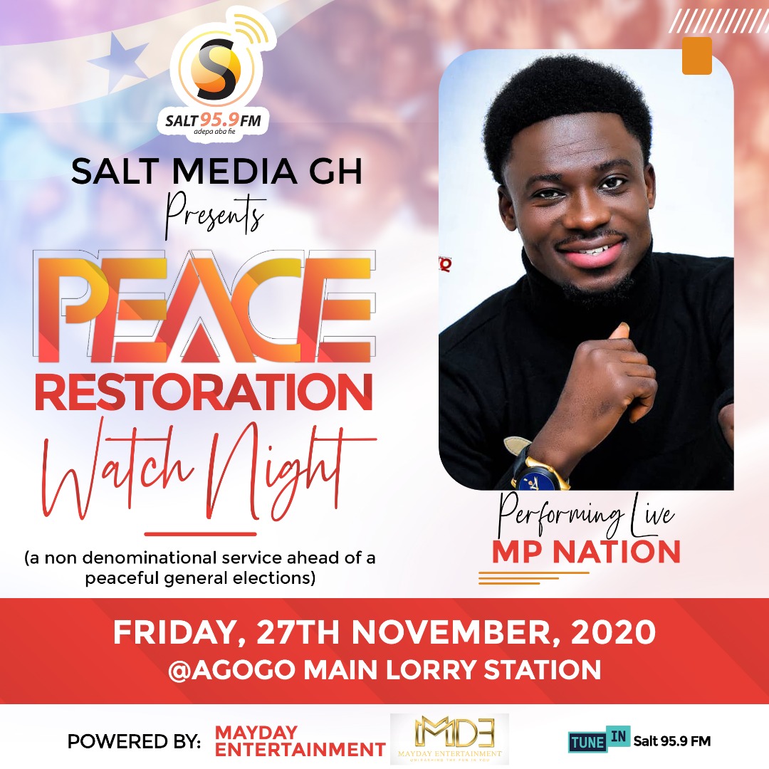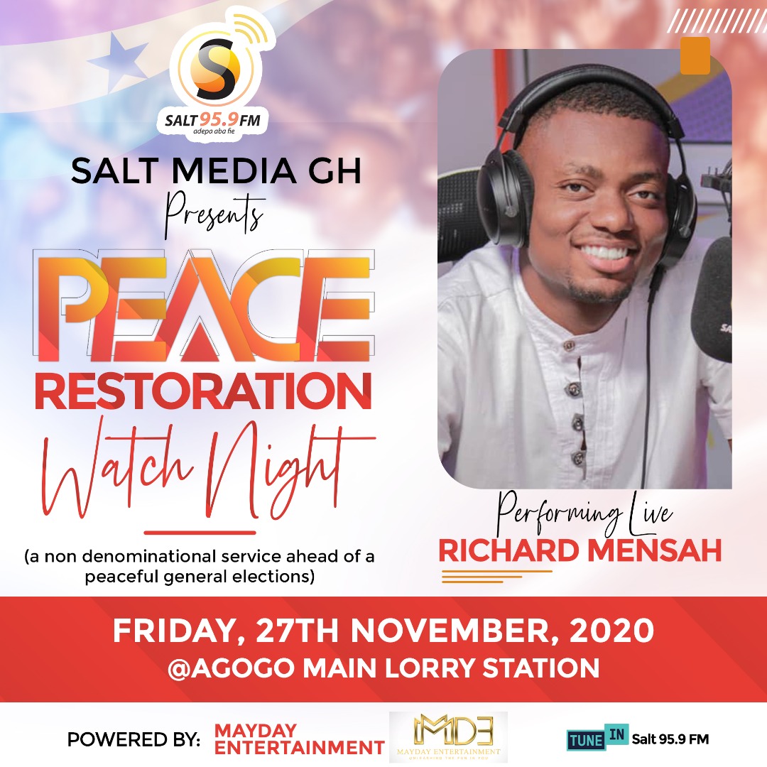 MayDay Entertainment in collaboration with Salt Media GH has launched the maiden edition of Peace Restoration Watch Night Ahead of the December 7 polls. The live worship all-night service will be held at the Asante Akyem Agogo Main Lorry Station on Friday 27 November 2020.