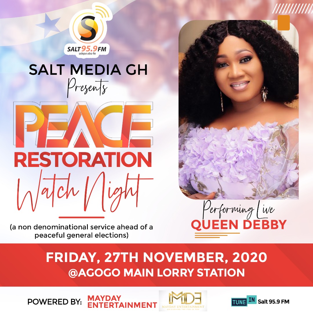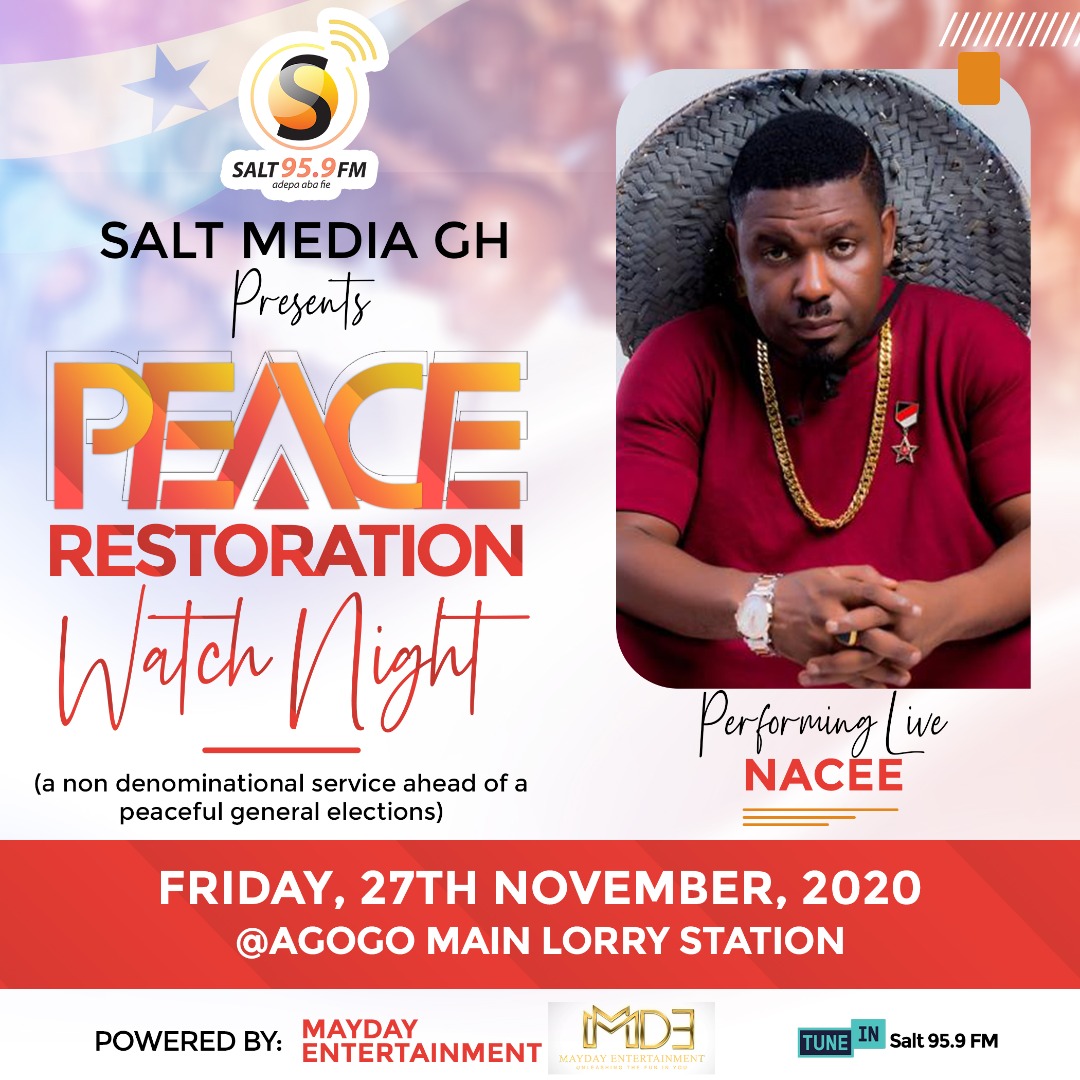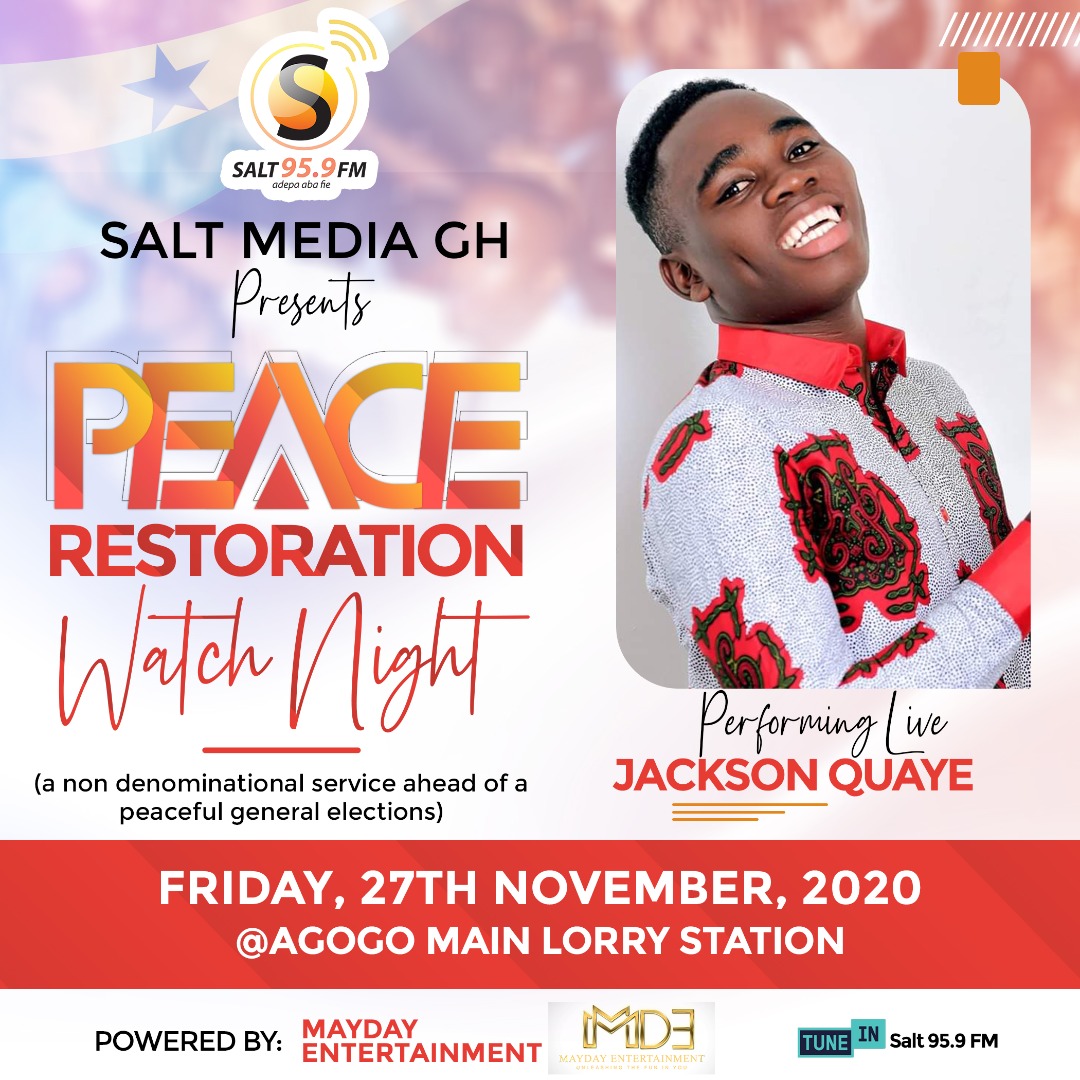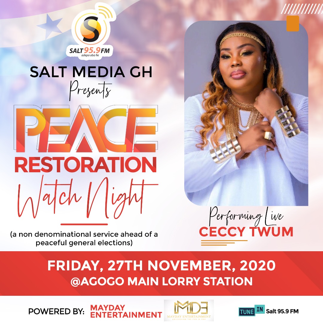 MayDay Entertainment in collaboration with Salt Media GH has launched the maiden edition of Peace Restoration Watch Night Ahead of the December 7 polls. The live worship all-night service will be held at the Asante Akyem Agogo Main Lorry Station on Friday 27 November 2020.