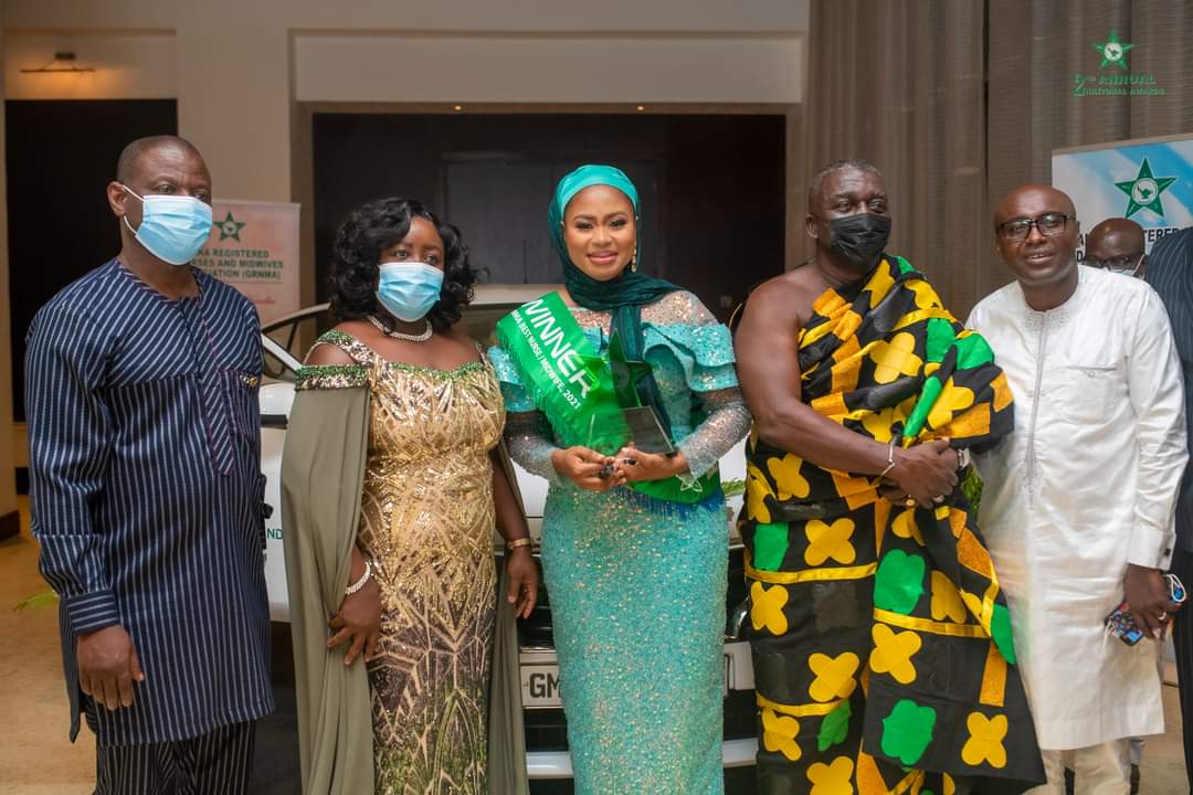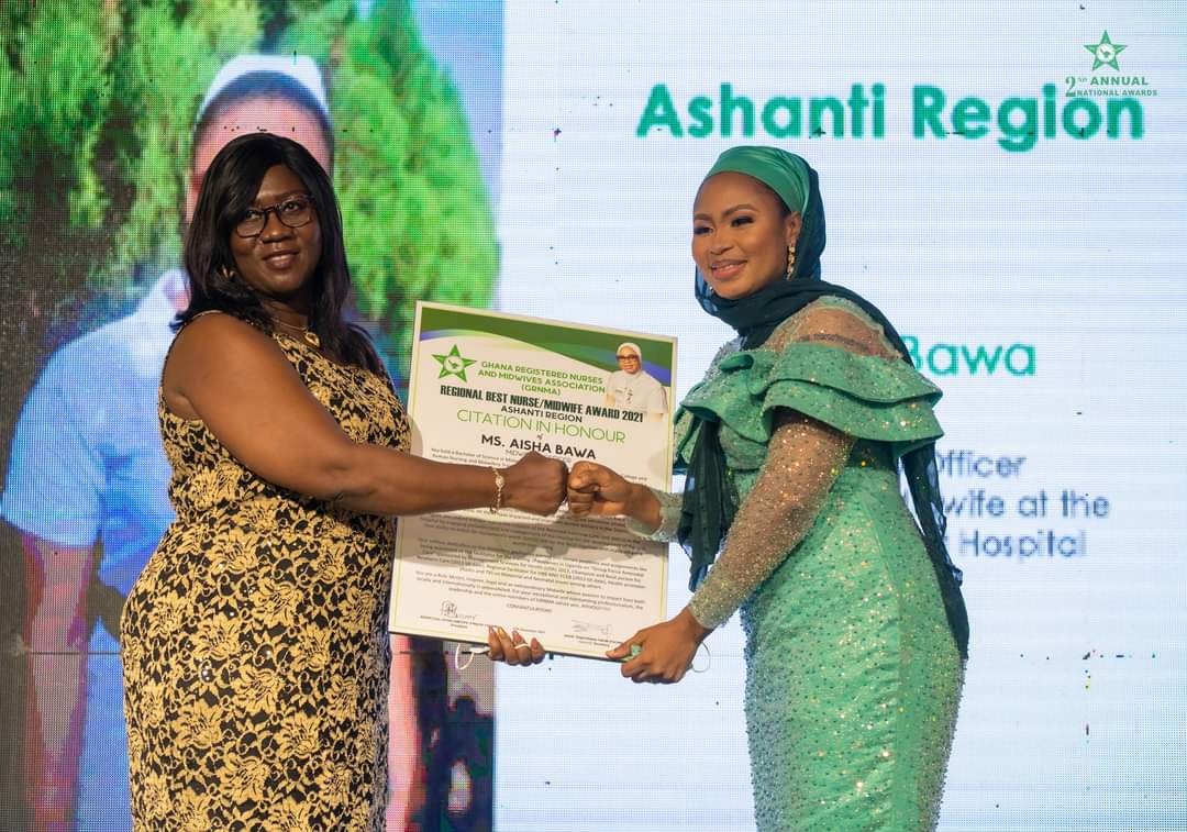 Aisha Bawa, a registered midwife at the Manhyia district hospital in Ashanti Region has been adjudged the national best Nurse/Midwife for 2021 at the Ghana Registered Nurses and Midwives Association 2nd Annual National Awards 2021. #GRNMAawards21